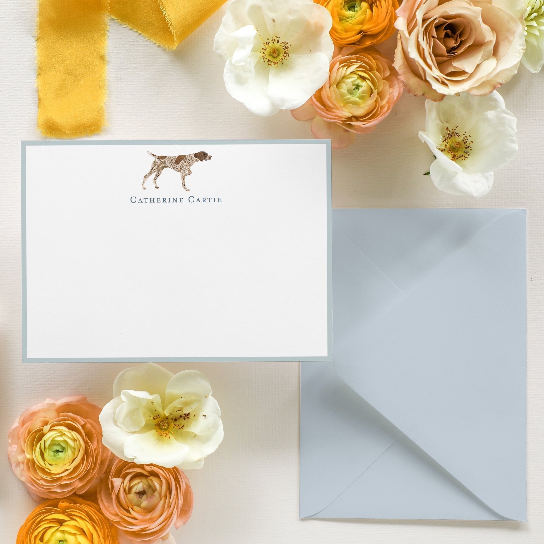 Set of 25 5x7 notecards with personalization. Choice of white, blue, or blush Euro flap envelopes and gift box included. Choice of blush or blue colorway for the notecards. Dog patterned liner optional.